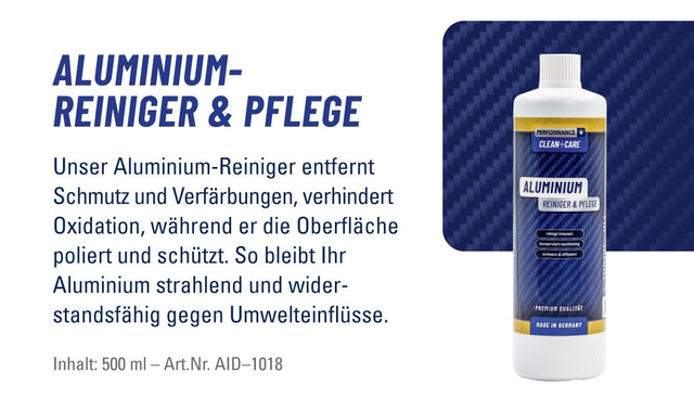 Unser Aluminium-Reiniger entfernt Schmutz und Verfärbungen, verhindert Oxidation, während er die Oberfläche poliert und schützt. So bleibt Ihr Aluminium strahlend und widerstandsfähig gegen Umwelteinflüsse. Inhalt: 500ml
