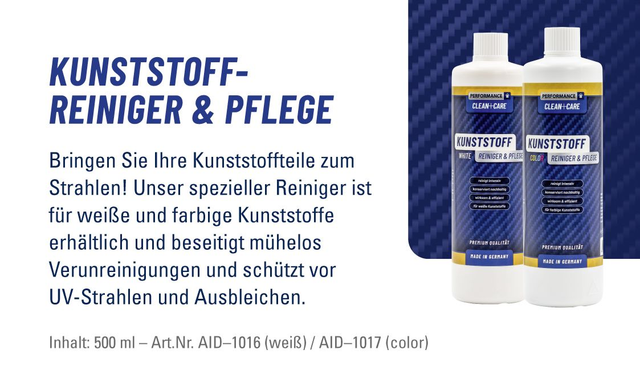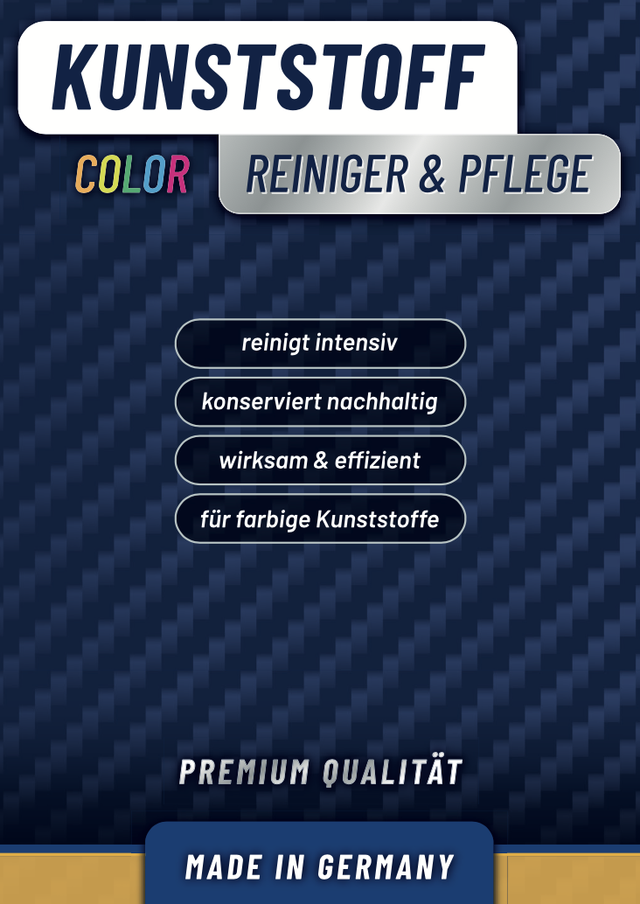 Bringen Sie Ihre Kunststoffteile zum Strahlen! Variante für farbige Kunststoff-Oberflächen. Unser spezieller Reiniger ist für weiße und farbige Kunststoffe erhältlich und beseitigt mühlelos Verunreinigungen und schützt vor UV-Strahlen und Ausbleichen. Inhalt: 500ml